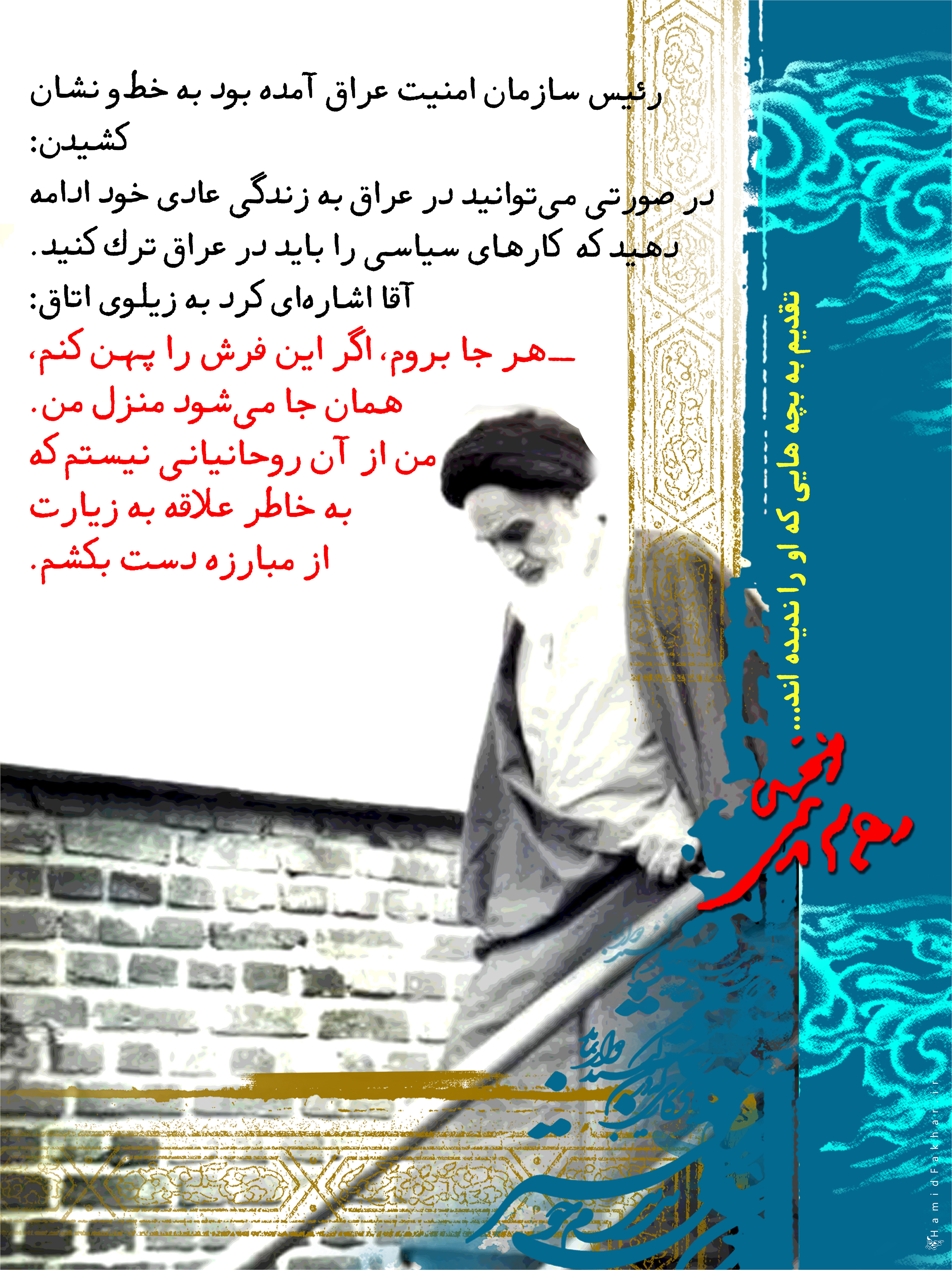 – هر جا بروم، اگر اين فرش را پهن كنم، همان جا ميشود منزل من. من از آن روحانياني نيستم كه به خاطر علاقه به زيارت از مبارزه دست بكشم.