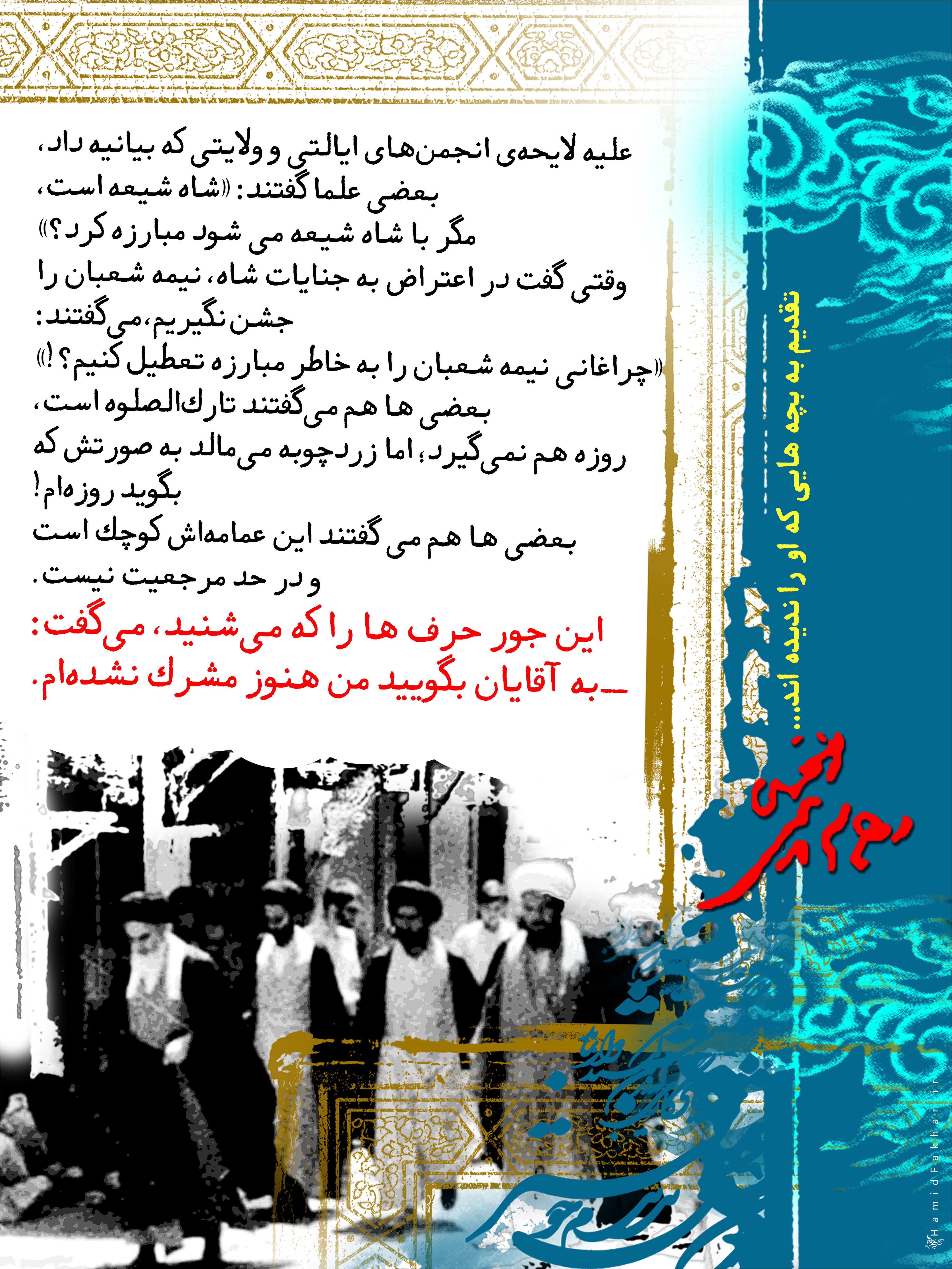 وقتي گفت در اعتراض به جنايات شاه، نيمه شعبان را جشن نگيريم، ميگفتند: «چراغاني نيمه شعبان را به خاطر مبارزه تعطيل كنيم؟!»